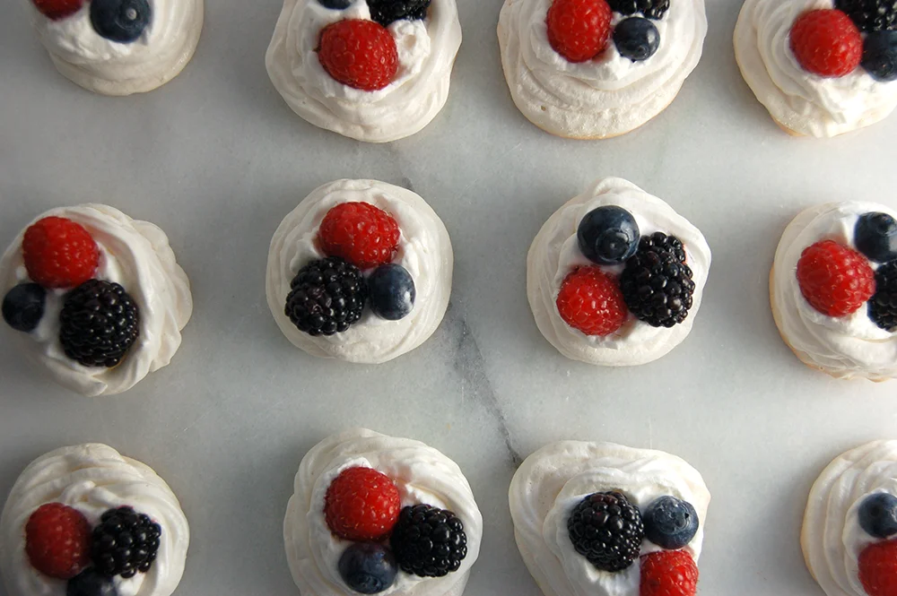 - Springtime Meringues - Berries, Mango, and custard, spectacularly presented in a piped meringue 'nest.'
