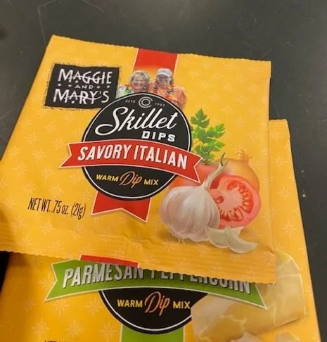 Time for another delicious demo! We’ll be featuring some warm and tempting skillet dips from Maggie and Mary’s. They’re perfect to make and serve in a cast iron skillet or any interesting baking dish. Just open the package, mix, bake and serve with crostini, bread sticks or pita chips.